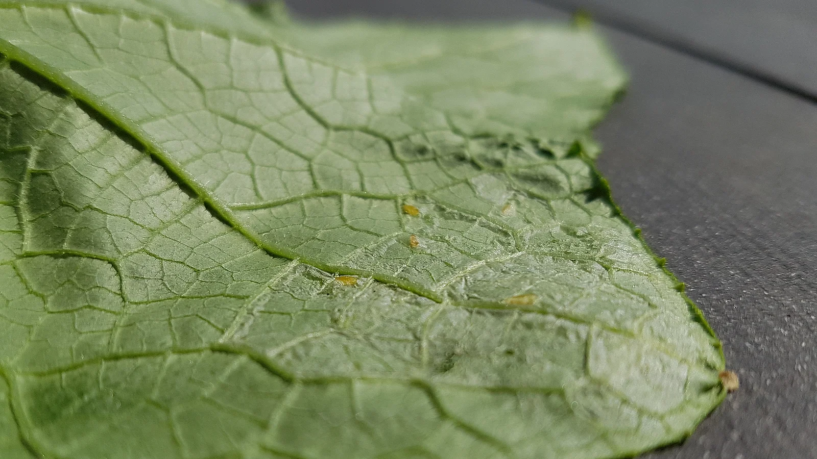 Die Ober- und Unterseite der Blätter bleibt verschont, es bildet sich nur im Inneren eine Art Höhlengangsystem.