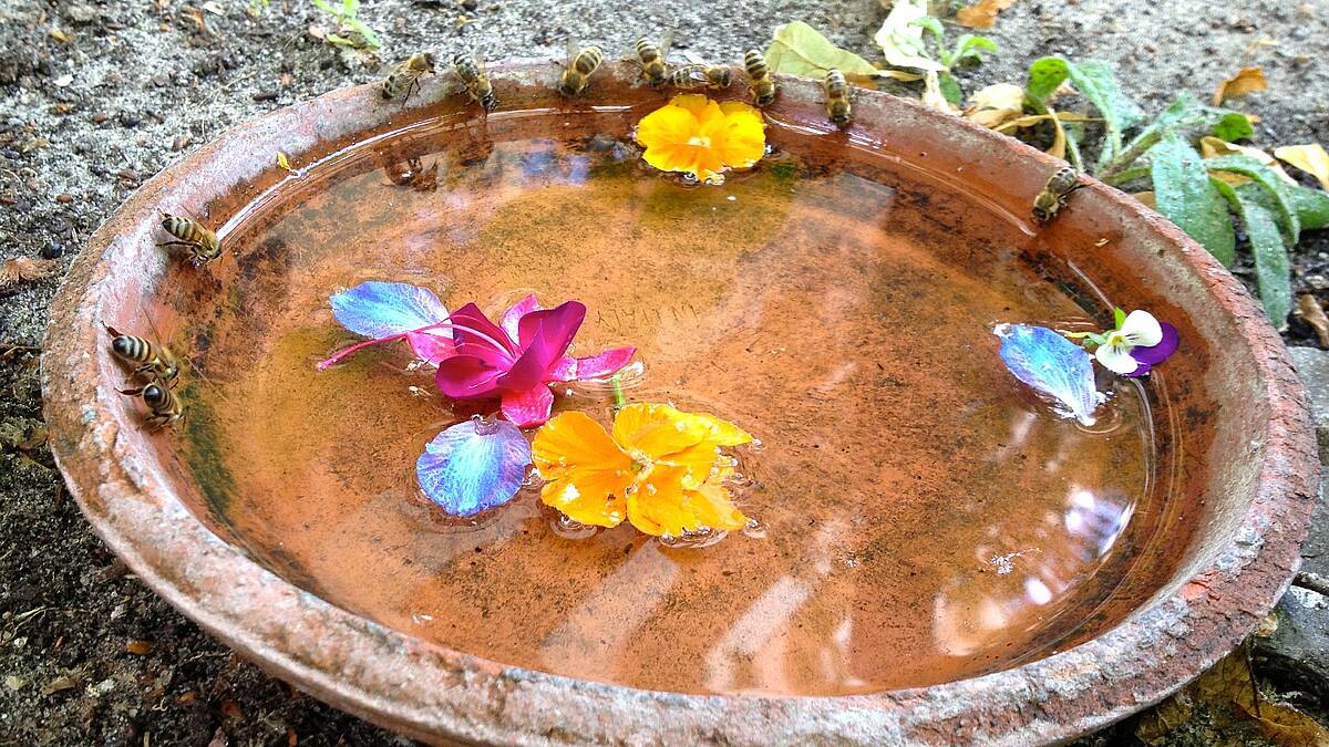 Nicht nur die Pflanzen leiden unter der andauernden Hitze und Sonne. Auch tierische Stadtbewohner wie Fliegen, Insekten und Eichhörnchen finden momentan kaum Trinkbares. Eine kleine Tränke kann ihnen schon dabei helfen, wieder gesund und munter zu werden und nicht krank zu werden. So eine Wasserstelle für durstige Hummeln, Bienen und Co. ist schnell errichtet: einfach eine flache Wasserschale an einen sonnigen, windstillen Ort stellen und sie mit kleinen Landeflächen, zum Beispiel Steinen, bestücken. Auf die Art sorgt ihr gleichzeitig für mehr Summ Summ auf eurem Balkon und für die rege Bestäubung eurer Pflanzen.