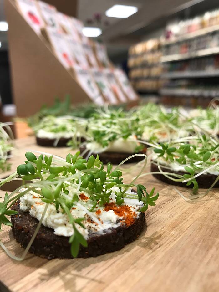 Einfach die kleinen Stängel weit unten direkt über dem Substrat abschneiden und zusammen mit Frischkäse auf einem Pumpernickel servieren. Paprikapulver, Salz und Pfeffer runden den kleinen Leckerbissen wunderbar ab. Auch sehr lecker ist Kressepesto.
