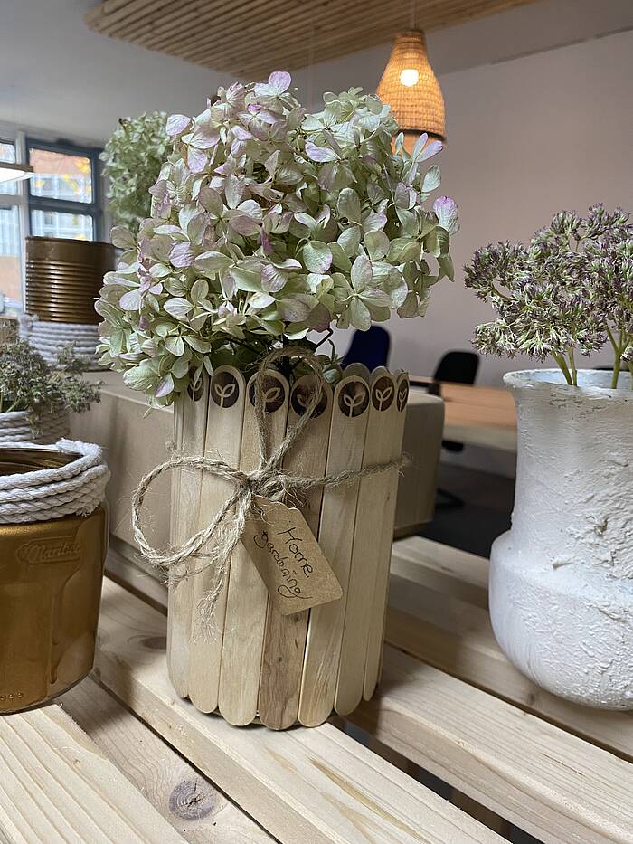 Für die erste Idee klebst du die Holzstäbchen der Reihe nach um das Gefäß. Das Ganze lässt du dann für etwa 10 Minuten trocknen. Zum Schluss kannst du ein wenig von dem Juteband abschneiden und es dekorativ um das Gefäß binden. Ich habe z.B. noch ein kleines Schild daran befestigt, welches ich zuvor mit dem Namen der Pflanze beschriftet habe, die ich für meinen DIY-Pflanzentopf verwenden möchte.