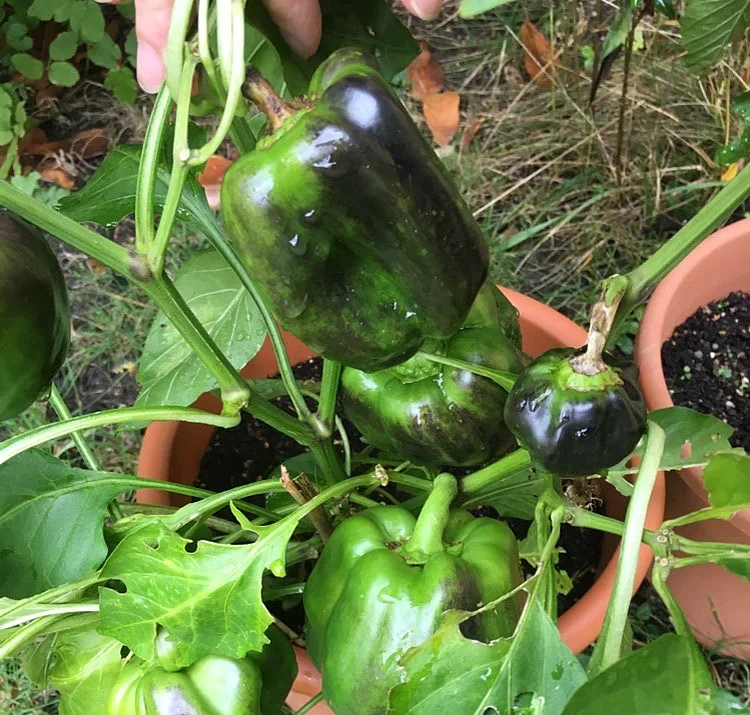 Eine Paprika ist fast ausgereift; die andere lässt sich noch ein wenig Zeit. Beide sind an diesem Punkt jedoch bereits genießbar und sehr gesund.